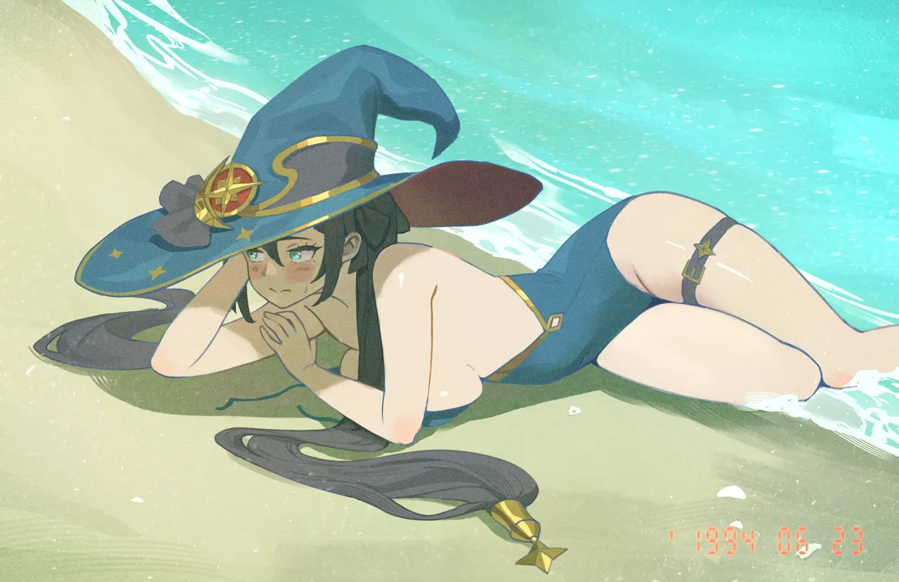 1girlbare_shouldersbeachblack_hairblue_hatblue_one_piece_swimsuitblushbowbreastsclosed_mouthcovered_navelembarrassedgold_trimgreen_eyeshair_ribbonhathat_bowhat_ornamentlong_hairlooking_to_the_sidelyingmedium_breastsnavelon_sideone_piece_swimsuitoutdoorsribbonsandshoresideboobsolostar__symbolsweatdropswimsuitthigh_strapthighstwintailsuntied_swimsuitwaterwetwitch_hat